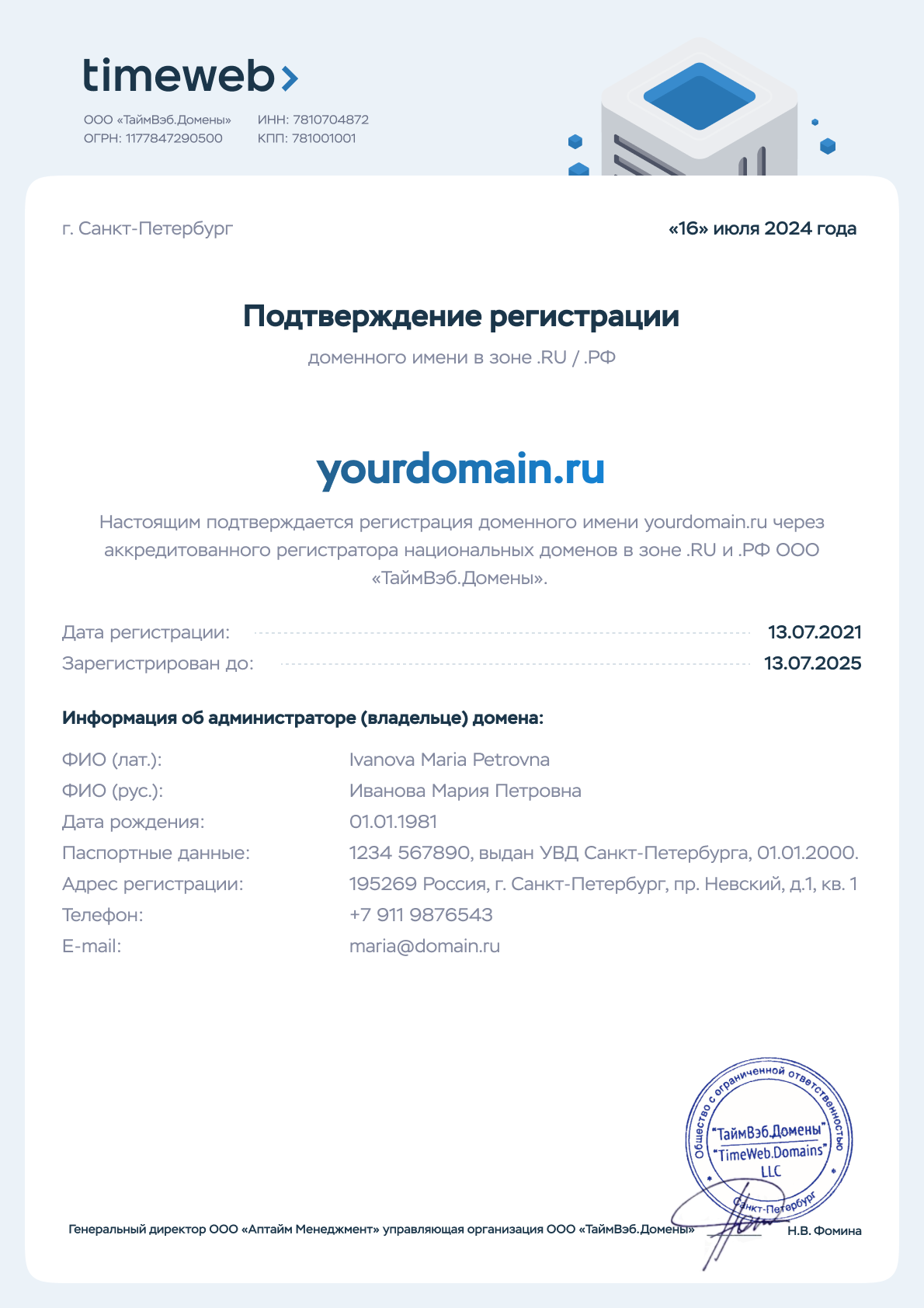 Для доменов .RU и .РФ, зарегистрированных через ТаймВэб.Домены, вы можете заказать Свидетельство о владении доменом (скачать образец).